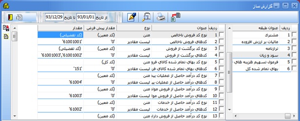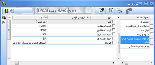 اين گزارش به شما اين امكان را مي دهد با توجه به كدينگ تعريف شده در سيستم شما و نوع گزارشي كه ميخواهيد تهيه نماييد فرمولهاي متناسب را نوشته و با ابزار طراحي و انتخاب فرم چاپي، فرم دلخواه را طراحي نماييد.