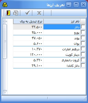 در اين پنجره ميتوان اسامي تمامي ارزهايي را كه در سند حسابداري مورد استفاده قرار مي گيرند، تعريف نمود. ضريب تبديل هر ارز را ميتوان به روز تعريف نمود. ممكن است ارز در برخي موسسات و شركتها كاربرد نداشته باشد كه در آن صورت الزامي براي تعريف آنها نبوده و ميتوان از آنها صرف نظر نمود.