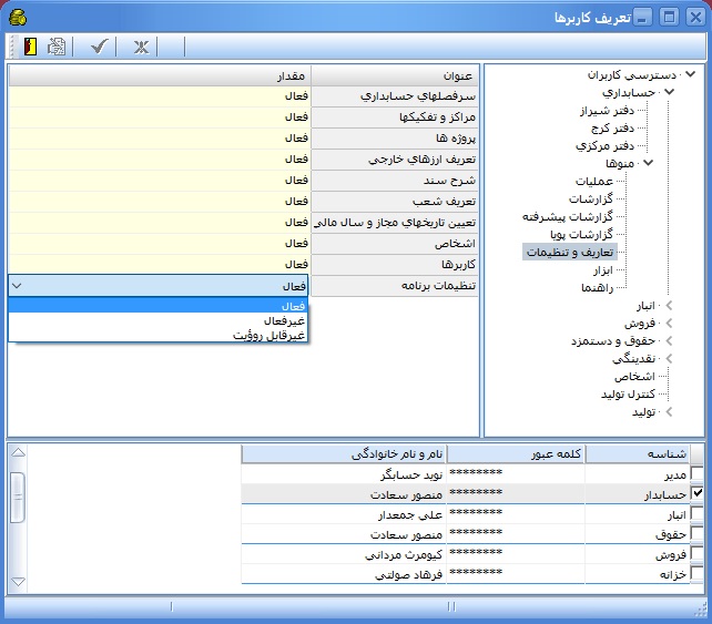 به منظور تعريف منوهاي فعال براي هركاربر ميتوان توسط آيتم "منوها" واقع در زير مجموعه حسابداري هر منو از برنامه را براي كاربر(ها) به حالت "فعال"،"غير فعال" و "غير قابل رويت" تنظيم نمود. براي اين كار كافي است از پنجره تعريف كاربرها، كاربر و منوي دلخواه انتخاب و وضعيت نمايش را تنظيم نمود.
