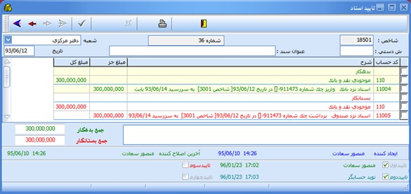 بدين منظور چهار تاييد در قسمت انتهايي پنجره سند حسابداري، تعبيه شده اند. درصورتيكه كاربر داراي اين مجوز باشد (رجوع به فصل "تعاريف" مبحث "تعريف كاربران")، بسته به نوع مجوز (تاييد اول، دوم، سوم و يا چهارم)، گزينه متناظر آن فعال شده و كاربر ميتواند با انتخاب آن، سند را تاييد نمايد.