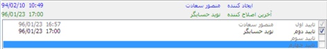 بدين منظور چهار تاييد در قسمت انتهايي پنجره سند حسابداري، تعبيه شده اند. درصورتيكه كاربر داراي اين مجوز باشد (رجوع به فصل "تعاريف" مبحث "تعريف كاربران")، بسته به نوع مجوز (تاييد اول، دوم، سوم و يا چهارم)، گزينه متناظر آن فعال شده و كاربر ميتواند با انتخاب آن، سند را تاييد نمايد.