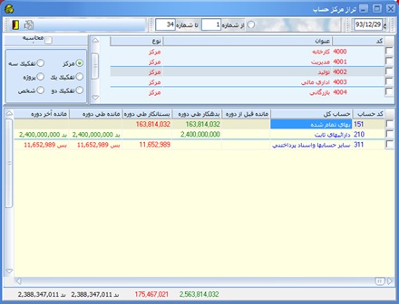 اين گزارش تراز حساب هر كدام از مراكز، اشخاص، تفكيكها و پروژهها را در ترازهاي كل و معين و تفصيلي با انتخاب هر كدام از فيلدها نشان مي دهد. تراز مورد نظر در قسمت پاييني پنجره با كليك كردن روي كليد محاسبه مشاهده مي گردد