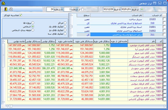 اين گزارش كاملا شبيه گزارش "تراز دورهاي" ميباشد. با اين تفاوت كه عمليات روي سطوح انجام ميشود. با انتخاب مركز يا تفكيكها يا پروژه يا اشخاص و فعال نمودن گزينه آنها تراز حساب آنها به صورت اتوماتيك براي كاربر در قسمت پاييني پنجره نشان داده مي شود (به طور خلاصه تراز دوره اي به صورت كلي ميباشد ولي حساب تركيبي به صورت جزء به جزء و به تفكيك مراكز، پروژهها و اشخاص ميباشد