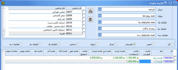اين گزارش مانده حسابهاي كل، معين و تفصيلي و مراكز و پروژهها و اشخاص را براساس انتخاب كاربر، در ماههاي مختلف با يكديگر مقايسه ميكند. براي اين كار با انتخاب سرفصل مورد نظر در بالاي صفحه و زدن كليد محاسبه مانده حسابهاي مورد نظر در ماههاي مختلف محاسبه و نمايش داده خواهند شد. مانده بدهكار و مانده بستانكار نيز توسط رنگ و پرانتز، قابل شناسايي مي باشند