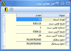 اين گزارش آمار اسناد را به طور اجمالي نشان ميدهد. اين اطلاعات شامل تعداد اسناد، شماره و تاريخ اولين سند،