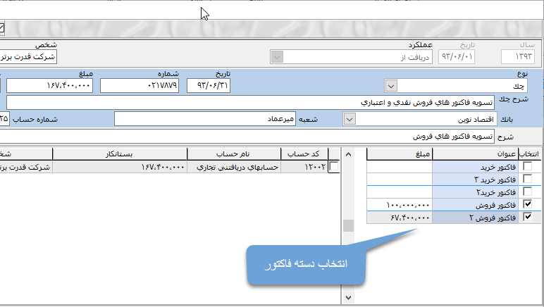 انتخاب دسته فاكتور براي دو عملكرد "دريافت از" و "پرداخت به" قابل انجام است بدين صورت كه پس از عملكرد هاي فوق ليستي از دسته فاكتور هاي تعريف شده در سيستم خريد و فروش براي كاربر نمايش داده مي شود و ميتواند تيك كنار هر دسته فاكتور را بزند.
