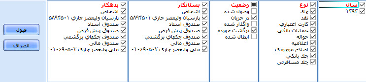 با استفاده از اين كليد ميتوان اسناد مورد نياز براي مشاهده و اصلاح را با استفاده از آيتم هاي موجود در اين پنجره فيلتر نمود. براي فيلتر مي بايست بر روي اين گزينه كليك نماييد و سپس موارد مورد نياز را انتخاب و در انتها كليد قبول را بزنيد، در صورت انصراف نيز ميتوانيد بر روي گزينه انصراف كليك نماييد.