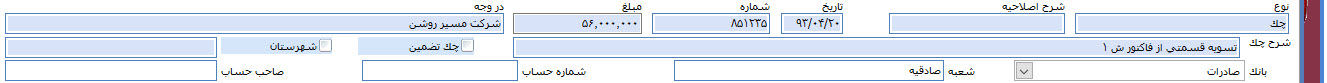 در صورت دريافت چك از اشخاص مي توان نام صاحب چك را در اين حوزه وارد نمود. ورود اطلاعات اين حوزه ضروري نمي باشد.