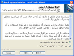 پس از كليك نمودن دكمه "Next" در پنجره خوش آمد گويي، صفحه "اجازه استفاده از برنامه ها" نمايش مي يابد. در اين پنجره توافقنامه استفاده از برنامه هاي بكر نمايش مي يابد ، در صورت تاييد آن توسط كاربر، ادامه نصب برنامه ها ميسر خواهد بود؛ در غير اين صورت، اجازه نصب صادر نخواهد شد. به منظور موافقت با مفاد درج شده، بايد گزينه "موارد مطرح شده در متن فوق پذيرفته مي شود" را انتخاب و كليد "Next" را كليك نمود.