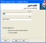 در اين مرحله و پس از موافقت كاربر با توافقنامه، صفحه "اطلاعات مشتري" نمايش مي يابد. در اين پنجره بايد نام كاربر در كادر "نام كاربر" و نام سازمان استفاده كننده از اين برنامه، در كادر "سازمان" درج شود. در صورتيكه گزينه "Anyone who uses this computer (all users)" انتخاب شود، كليه كاربراني كه از كامپيوتر مورد نظر استفاده مي نمايند، به برنامه هاي نصب شده دسترسي خواهند داشت؛ اما درصورت انتخاب گزينه "Only for me"، تنها كاربري كه برنامه را نصب نموده است، مجوز استفاده از آن را خواهد داشت. ورود به مرحله بعد نيز توسط دكمه "Next" صورت مي پذيرد.
