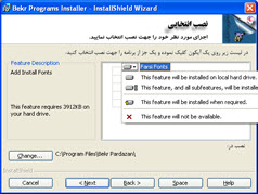 لازم به ذكر است كه اجزاي لازم براي نصب برنامه ها را كه شامل فونتهاي فارسي (Farsi Fonts)، موتور بانك اطلاعاتي (Database Engine) و فايل هاي سيستمي لازم (Required System Files) مي باشد، بايد حداقل يك بار بر روي كامپيوترها نصب گردند. و نصب برنامه ها مي تواند به زمان ديگري موكول گردد.