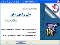 پس از انجام مراحل نصب، سيستم با نمايش پنجره اي، خاتمه عمليات نصب را اعلام مي نمايد. به منظور پايان پذيرفتن اين عمليات، از كليد "Finish" استفاده مي گردد. بدين ترتيب مراحل نصب سيستم هاي بكر، به پايان مي رسد.