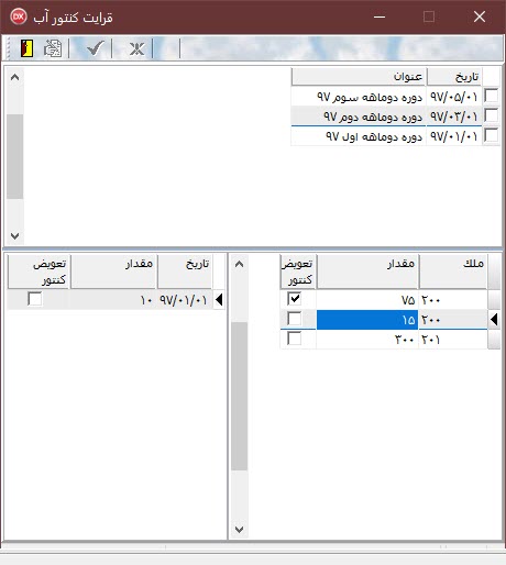 پس از انتخاب واحد و درج مقدار آب مصرفي در جدول جزييات، در جدول روبرويي اين پنجره سوابق شمارنده كنتور در دوره هاي قبلي واحد مورد نظر نمايش داده مي شود تا كمك شاياني در جهت جلوگيري از اشتباه در ورود اطلاعات به كاربر انجام شده باشد.