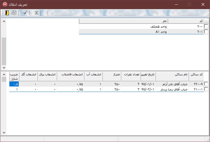 اين پنجره داراي سه بخش نوار ابزار، جدول اصلي و جدول جزييات مي باشد و يكي از مهم ترين بخش هاي تعاريف پايه اي برنامه مي باشد زيرا در اين بخش مشخص مي نماييم هر واحد داراي چه متراژ، شخص، وضعيت شارژ و آب و فاضلابي مي باشد. تغييرات ملك نيز در همين پنجره و در جدول جزييات انجام مي پذيرد(به طور مثال تغيير وضعيت ضريب شارژ واحد)و متناسب با دوره هاي تعريف شده محاسبات مورد نظر در قسمت عمليات انجام خواهد شد.