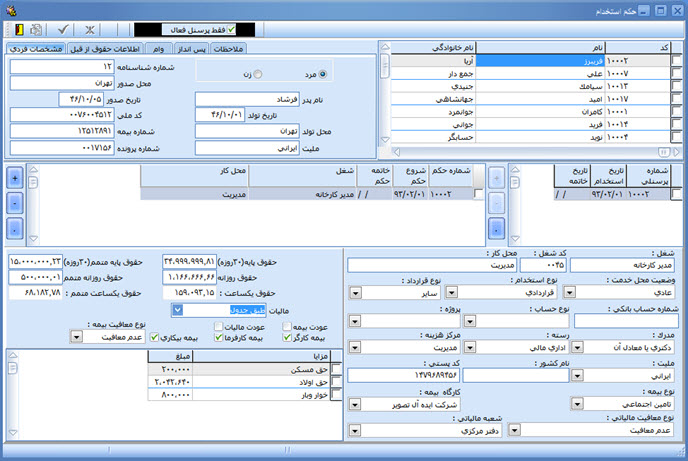 يكي از مهم ترين مراحل در تعاريف و تنظيمات برنامه حقوق و دستمزد بخش احكام استخدام مي باشد. به دليل تعيين مواردي مانند حقوق پايه، مزايا، نوع محاسبه بيمه و ماليات حقوق و ... ميتوان اين بخش را مبناي محاسبات حقوق و دستمرد ناميد.