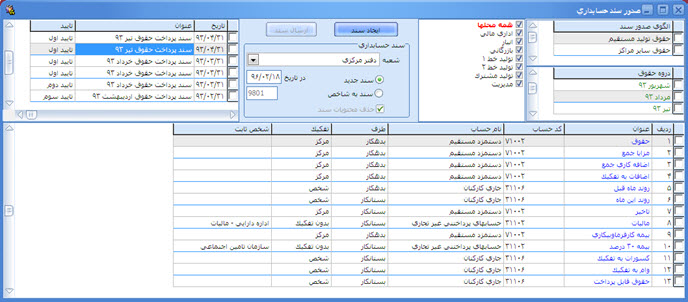 گاهي مواقع ممكن است به دليل وجود سرفصل هاي جداگانه حقوق براي محل هاي كار مختلف(به طور مثال دفتر مركزي و كارخانه) نياز باشد تا قالب هاي جداگانه براي صدور سند حسابداري تعريف گردد در اين صورت ميتوان با تعريف هر الگو در بخش الگوي صدور سند فرمت مورد نظر را تعريف نمود.