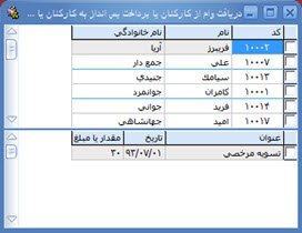 با ورود به اين پنجره، اسامي كليه پرسنل شاغل در سازمان، در جدول بالاي صفحه نمايش مي يابد. به منظور ثبت عمليات دريافت وام از كاركنان يا پرداخت پس انداز به كاركنان و يا تسويه مرخصي، كافيست تا پرسنل مورد نظر را از جدول مذكور انتخاب نموده و حوزه هاي "عنوان"، "تاريخ" و "مقدار يا مبلغ" را در جدول پايين وارد كرد.