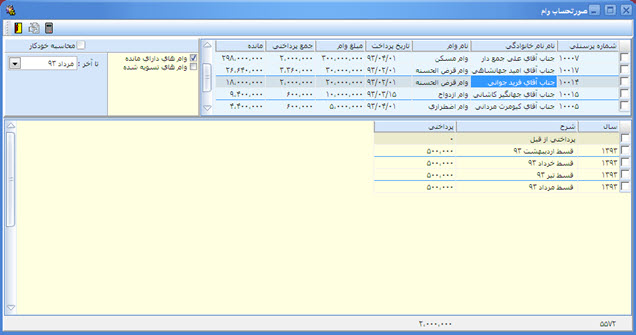 اين گزارش، به منظور آگاهي از صورتحساب وامهاي دريافتي توسط پرسنل و به تفكيك وام، طراحي شده است؛ كه ميتوان اطلاعات مذكور را براي وامهاي داراي مانده و يا كليه وامها، مشاهده نمود. اين پنجره اطلاعات مورد نظر را در دو جدول، نشان ميدهد. در جدول بالاي صفحه، مشخصات وام و وام گيرنده مشاهده ميشود؛ كه با انتخاب هر شخص، در جدول پايين، ريز اطلاعات مربوط به وام، از تاريخ دريافت وام تا دوره حقوق مورد نظر، به تفكيك دوره نمايش ميابد.