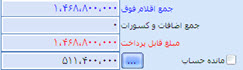 ته جمع فاكتور شامل چهار حوزة جمع اقلام فوق (با رنگ آبي)، اضافات و كسورات (با رنگ مشكي) و مبلغ قابل پرداخت (با رنگ قرمز ) و مانده حساب مشتري (با رنگ مشكي) ميباشد.