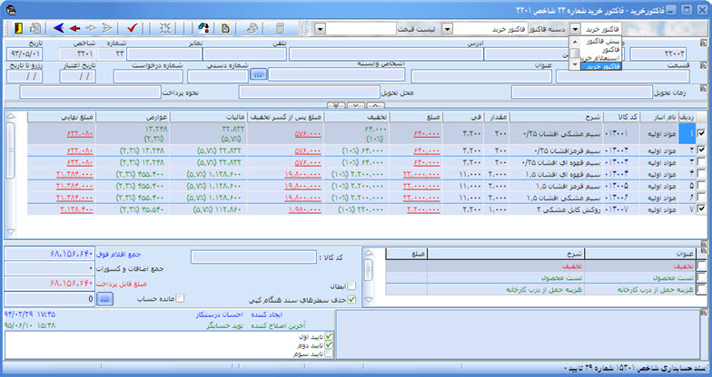 في خريد: با وارد نمودن اطلاعات ستون "ش ف خريد" اطلاعات اين ستون به صورت اتوماتيك تكميل و نمايش خواهد يافت.