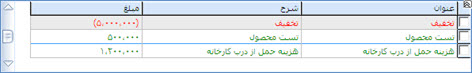 مبلغ پس از كسر تخفيف : در اين ستون حاصل تفاضل مبلغ و تخفيف نمايش داده خواهد شد و به صورت فقط خواندني مي باشد و با تغيير مقادير مبلغ و تخفيف اين حوزه نيز تغيير و به روز خواهد شد.