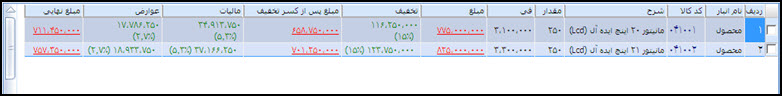 مبلغ نهايي : در اين ستون حاصل جمع ستون هاي مبلغ پس از كسر تخفيف و جمع ماليات و عوارض نمايش داده خواهد شد و به صورت فقط خواندني مي باشد.