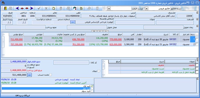 هر كاربري كه با كلمه عبور خود وارد سيستم ميشود، ميتواند در صورت داشتن مجوز، فاكتور را تاييد نمايد. بدين منظور سه تاييد در قسمت انتهايي پنجره فاكتور ، تعبيه شده اند. درصورتيكه كاربر داراي اين مجوز باشد (رجوع به فصل "تعاريف" مبحث "تعريف كاربران")، بسته به نوع مجوز (تاييد اول، دوم و يا سوم)، گزينه متناظر آن فعال شده و كاربر ميتواند با انتخاب آن، فاكتور را تاييد نمايد. بعنوان مثال در نظر بگيريد كه شركتي داراي صادر كننده، مدير فروش و حسابدار فروش باشد.