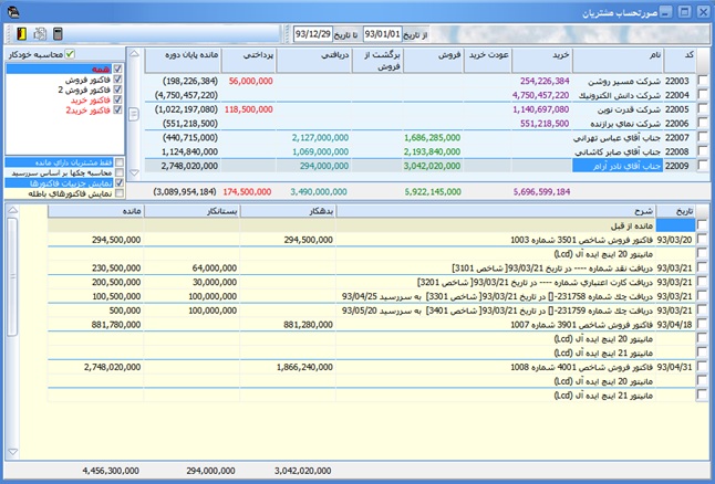 اطلاعات صورتحساب مشتريان در دوره زماني مورد نظر و قبل از آن دوره در جدول فوقاني نمايش ميابد. ستونهاي قابل نمايش اين جدول عبارتست از : " كد"," نام"," نماينده/مشتري"," تلفن"," فاكس"," مانده خريد قبل از دوره"," مانده فروش قبل از دوره"," دريافتي قبل از دوره"," پرداختي قبل از دوره"," مانده قبل از دوره"," جمع اقلام (خ)"," تخفيف (خ)"," جمع اقلام پس از كسر تخفيف (خ)"," ماليات (خ)"," عوارض (خ)"," جمع نهايي اقلام (خ)"," اضافات (خ)"," كسورات (خ)"," خريد"," عودت خريد"," مانده خريد"," جمع اقلام (ف)"," تخفيف (ف)"," جمع اقلام پس از كسر تخفيف (ف)"," ماليات (ف)"," عوارض (ف)"," جمع نهايي اقلام (ف)"," اضافات (ف)"," كسورات (ف)"," فروش"," برگشت از فروش"," مانده فروش"," دريافتي"," پرداختي"," چكهاي برگشتي دريافتي"," چكهاي برگشتي پرداختي"," اسناد وصول نشده دريافتي"," اسناد وصول نشده پرداختي"," مانده طي دوره"," مانده خريد پايان دوره"," مانده فروش پايان دوره"," پرداختي پايان دوره"," دريافتي پايان دوره" و " مانده پايان دوره". با انتخاب مشتري مورد نظر، اطلاعات صورتحساب مشتري در جدول زير آن نشان داده ميشود. ستونهاي قابل نمايش اين جدول كه جزييات حساب مشتري را نشان ميدهد شامل تاريخ، شرح، بدهكار، بستانكار و مانده ميباشد.