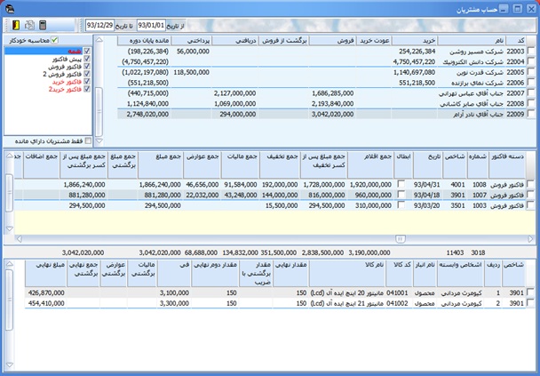 اين گزارش وضعيت حساب مشتريان را نشان ميدهد. در اين پنجره كاربر مي تواند با انتخاب يك يا چند نوع دسته فاكتور يا پيش فاكتور در هر دوره زماني دلخواه و سپس فشردن دكمه محاسبه ليست همه مشتريان موجود در دسته فاكتورهاي انتخاب شده را به همراه مشخصاتي مثل جمع اقلام جمع اضافات و كسورات و جمع نهايي را در بالاي پنجره و جزئيات شناسايي فاكتورها و پيش فاكتورها و كالاهاي موجود در آنها را در قسمت پايين پنجره مشاهده نمايد. بعبارت ساده تر كليهاسناد مشتري مورد نظر درهر دوره زماني دلخواه قابل مشاهده مي باشد. اين پنجره شامل پنج بخش ميباشد. در سمت راست پنجره، جدول انتخاب دسته فاكتور وجود دارد. با انتخاب دسته فاكتور و زدن دكمه محاسبه اطلاعات حساب مشتريان نمايش داده مي شود.