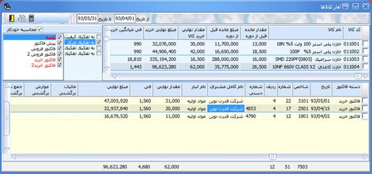 اين گزارش اطلاعات خريد و فروش كالاها در هر دوره زماني دلخواه را به همراه مشخصات فاكتور يا پيش فاكتور مربوطه در هر دوره زماني دلخواه نمايش مي دهد در اين گزارش كاربر ميتواند با انتخاب يك يا چند دسته فاكتور يا پيش فاكتور جمع اطلاعات خريد و فروش كالاها در دوره زماني دلخواه، در جدول فوقاني مشاهده نمايد.