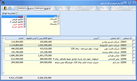 در اين صورت كاربر ميتواند با انتخاب دسته فاكتور، فصل و دوره زماني مورد نظر و سپس فشردن دكمه محاسبه ليست فروش خود به مشتريان را در جدول زير مشاهده نمايد. براي انتخاب بيش از يك دسته فاكتور كافيست تيك دسته فاكتورهاي دلخواه را فعال نماييد. ستونهاي قابل نمايش اين جدول عبارتند از : كد شخص، نام شخص، آدرس، كد اقتصادي،شماره ثبت، كد ملي، جمع اقلام، تخفيف، جمع اقلام پس از كسر تخفيف،ماليات، عوارض، جمع نهايي اقلام، برگشتي و مانده.