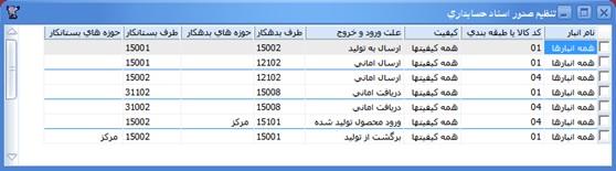 با ايجاد هر سطر در اين پنجره وانتخاب مقادير ستونهاي ، نام انبار ، كدكالا يا طبقهبندي، كيفيت، علت ورود و خروج، طرف بدهكار و بستانكار سند حسابداري، حوزهاي بدهكار و حوزه هاي بستانكار براي هر سطر از اسناد انبار كه با اين مقادير مطابقت دارند مشخص ميشود. به اين معني كه در صورت تطابق يك سطر از اسناد انبار با تمامي شروط ستونهاي نام برده، سند حسابداري براي آن سطر با طرف بدهكار و بستانكار مشخص شده قابل ايجاد است.