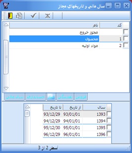 توجه به اين نكته ضروري است كه درصورت عدم تعريف محدوده زماني مجاز براي هيچيك از انبارهاي موجود، عمليات ثبت و تغيير اسناد در تمامي تاريخها امكانپذير خواهد بود. در غير اينصورت و با درج حتي يك رديف اطلاعات، انجام عمليات فوق تنها در تاريخهاي مجاز و تعريف شده ميسر بوده و بايد محدودههاي زماني مجاز را، براي كليه انبارها تعيين نمود.