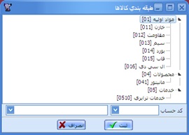 از طريق اين پنجره، ميتوان يك طبقهبندي درختي و نامحدود را به طور مجزا و مستقل از روش كدينگ، براي كالاها تعريف نموده و سپس آنها را به اين طبقهبنديها، اختصاص داد. لازم به ذكر است كه انجام اين عمليات در ابتداي راه اندازي و شروع به كار با سيستم ضرورتي نداشته و ميتوان تعريف طبقه بندي را در هر زماني انجام داد.