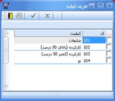 اين بخش از سيستم، به تعريف، اصلاح و حذف انواع كيفيك كالا اختصاص داده شده است. كيفيت كالا، به منظور تفكيك كالاهايي كه به لحاظ فني از يك نوع و داراي كدهاي يكسان بوده ولي به لحاظ كيفي، با يكديگر متفاوت ميباشند، مورد استفاده قرار ميگيرد. بهعنوان مثال درصورت خريد يك دستگاه تلفن جديد و نو، در بدو ورود به انبار كدي به آن تخصيص مييابد، پس از گذشت زمان و درصورت استهلاك دستگاه، اين تلفن مجدداً با همان كد به انبار بازگردانده ميشود. حال ميتوان از گزينه "كيفيت كالا"، به منظور تشخيص كالاي نو و دست دوم، استفاده نمود.