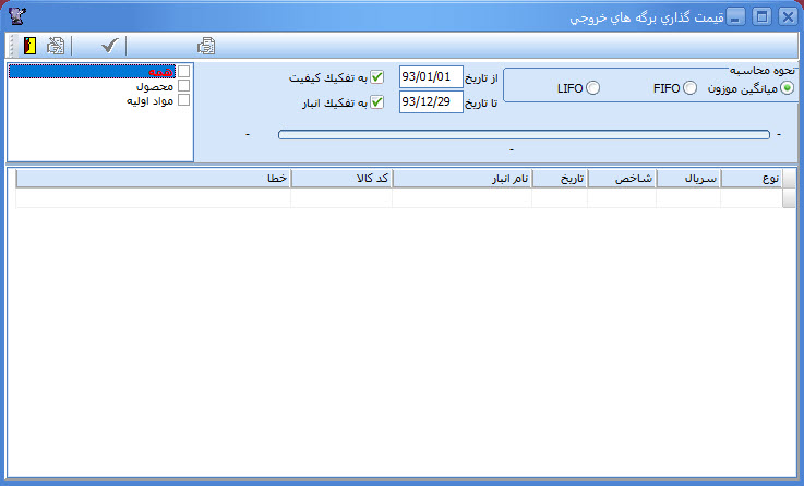 به منظور تعيين محدوده اسناد موثر در عمليات قيمت گذاري، ميبايست محدوده تاريخي مورد نظر براي انجام عمليات مذكور را تعيين نمود. بدين منظور تاريخ شروع دوره مورد نظر در حوزه "از تاريخ" و تاريخ خاتمه آن در در حوزه "تا تاريخ" درج ميگردد.