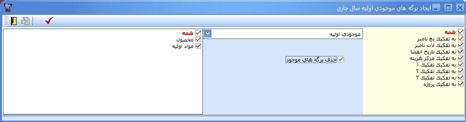 نوار ابزار شامل کلید های خروج و ثبت عملیات انتقال موجودی میباشد و همان طور که از نام آنها پیداست، کلید خروج برای خروج از این پنجره و کلید ثبت عملیات برای ثبت نهایی انتقال موجودی اولیه در سال مالی جاری می باشد.