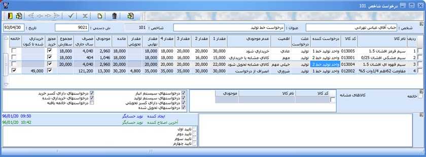 بدين منظور چهار تاييد در قسمت انتهايي پنجره درخواست كالا، تعبيه شده است.