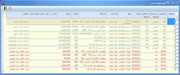 ستونهاي قابل نمايش در اين گزارش عبارتند از: شماره، شاخص، شماره دستي، سيستم مرتبط، عنوان، حسابداري، شاخص مرتبط، شماره مرتبط، تاريخ، نوع، علت ورود و خروج، تاييد، كد انبار، نام انبار، كد كالا، نام كالا،