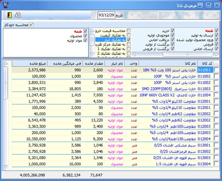 ستونهاي قابل نمايش در گزارش موجودي كالا شامل كد كالا،نام كالا، كد دوم، نام دوم، قفسه، واحد،واحد دوم، كيفيت، كد انبار، نام انبار، كد مركز هزينه، نام مركز هزينه، كد تفكيك اول، نام تفكيك اول، كد تفكيك دوم، نام تفكيك دوم،كد تفكيك سوم، نام تفكيك سوم، كد پروژه،نام پروژه، موجودي اوليه مقدار، موجودي اوليه في ميانگين، موجودي اوليه مبلغ، موجودي اوليه مقداردوم، مقدار وارده، في ميانگين وارده، مبلغ وارده، مقداردوم وارده، مقدار صادره، في ميانگين صادره، مبلغ صادره، مقداردوم صادره،مقدار مانده، في ميانگين مانده، مبلغ مانده و مقداردوم مانده ميباشد.