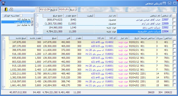 با انتخاب اين گزينه كاردكس كالاي اشخاص به تفكيك كالا و كيفيت نمايش داده مي شود.