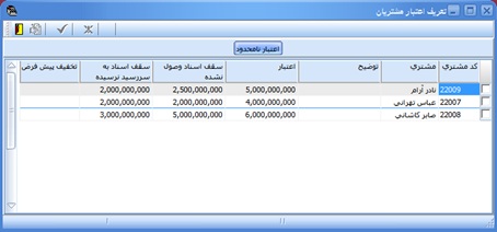 در سيستم فروش به جهت كنترل مشتريان و كاربران در ثبت اسناد از بخش اعتبار مشتريان ميتوان به عنوان ابزاري كنترلي بر اساس متغييرهاي مختلف همچون ميزان بدهي، اسناد پرداختي وصول نشده و اسناد پرداختي به سر رسيد نرسيده استفاده نمود. همچنين در اين پنجره ميتوان براي مشتريان تخفيف پيش فرض در نظر گرفت تا در زمان صدور اسناد خريد و فروش اين تخفيف به صورت خودكار محاسبه شود، روش ورود اطلاعات و تعريف اعتبار براي همه مشتريان، گروه هاي مختلفي از مشتريان و يا هر مشتري به روش زير مي باشد: