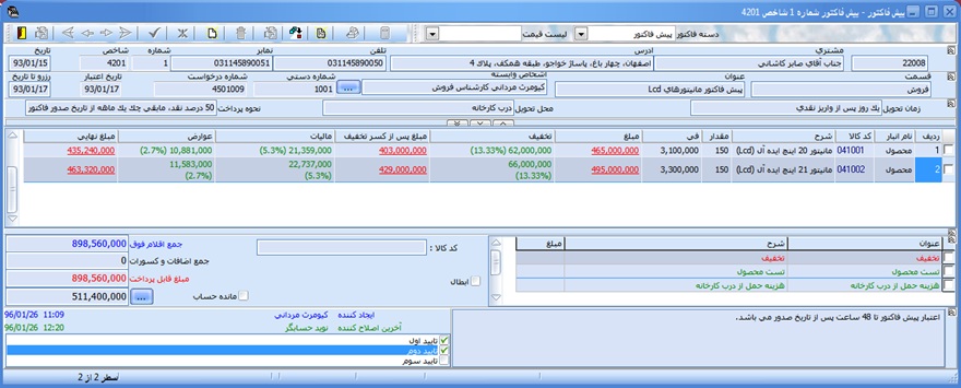 اين پنجره همانند پنجره فاكتور به چند بخش اصلي نوار ابزار، اطلاعات شناسايي پيش فاكتور، جدول جزئيات پيش فاكتور، اضافات و كسورات، ته جمع مبالغ، ملاحظات و توضيحات، مشخصات كاربران و تاييدهاي پيش فاكتور تقسيم ميگردد و امكان ثبت پيش فاكتور فروش را براي كاربر فراهم مي سازد. بخش نوار ابزار پيش فاكتور كاملا شبيه نوار ابزار فاكتور ميباشد. لذا به منظور جلوگيري از تكرار مطالب تنها به توضيح تفاوتهاي آن مي پردازيم. براي ايجاد يك پيش فاكتور ابتدا نام مشتري، شماره دستي، و ساير جزئيات را در بالاي پنجره پيش فاكتور درج نموده سپس آرتيكلها را در جدول جزئيات ثبت مي نماییم، بعد از وارد كردن اطلاعات بايد توسط دكمه "ثبت" واقع در نوار ابزار ثبت نمود. در قسمت اطلاعات شناسايي سند واقع در بالاي پنجره دو قسمت اعتبار و رزرو تا تاريخ وجود دارد حال به توضيح هر يك از اين مطالب مي پردازيم.